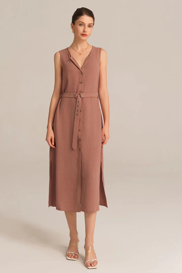 Μίντι φόρεμα. Χαλαρή εφαρμογή, κουμπιά μπροστά και φαρδιά, αφαιρούμενη ζώνη. Χωρίς φόδρα.