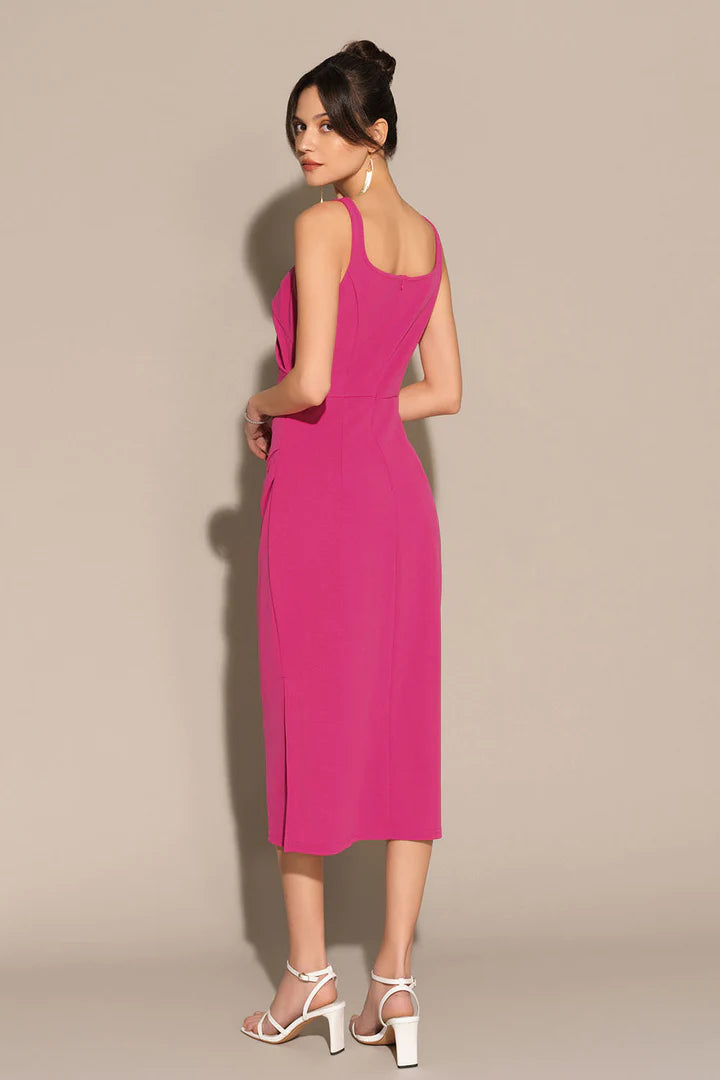 Εφαρμοστό μίντι φόρεμα με φαρδιές τιράντες. Χωρίς επένδυση και φόδρα. Κρυφό φερμουάρ στην πλάτη.