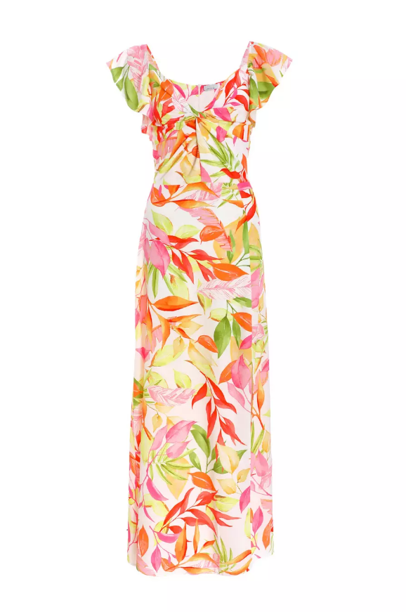 Μάξι φόρεμα με βολάν, ντεκολτέ σε σχήμα και σκίσιμο. Κρυφό φερμουάρ στην πλάτη. Χωρίς φόδρα.