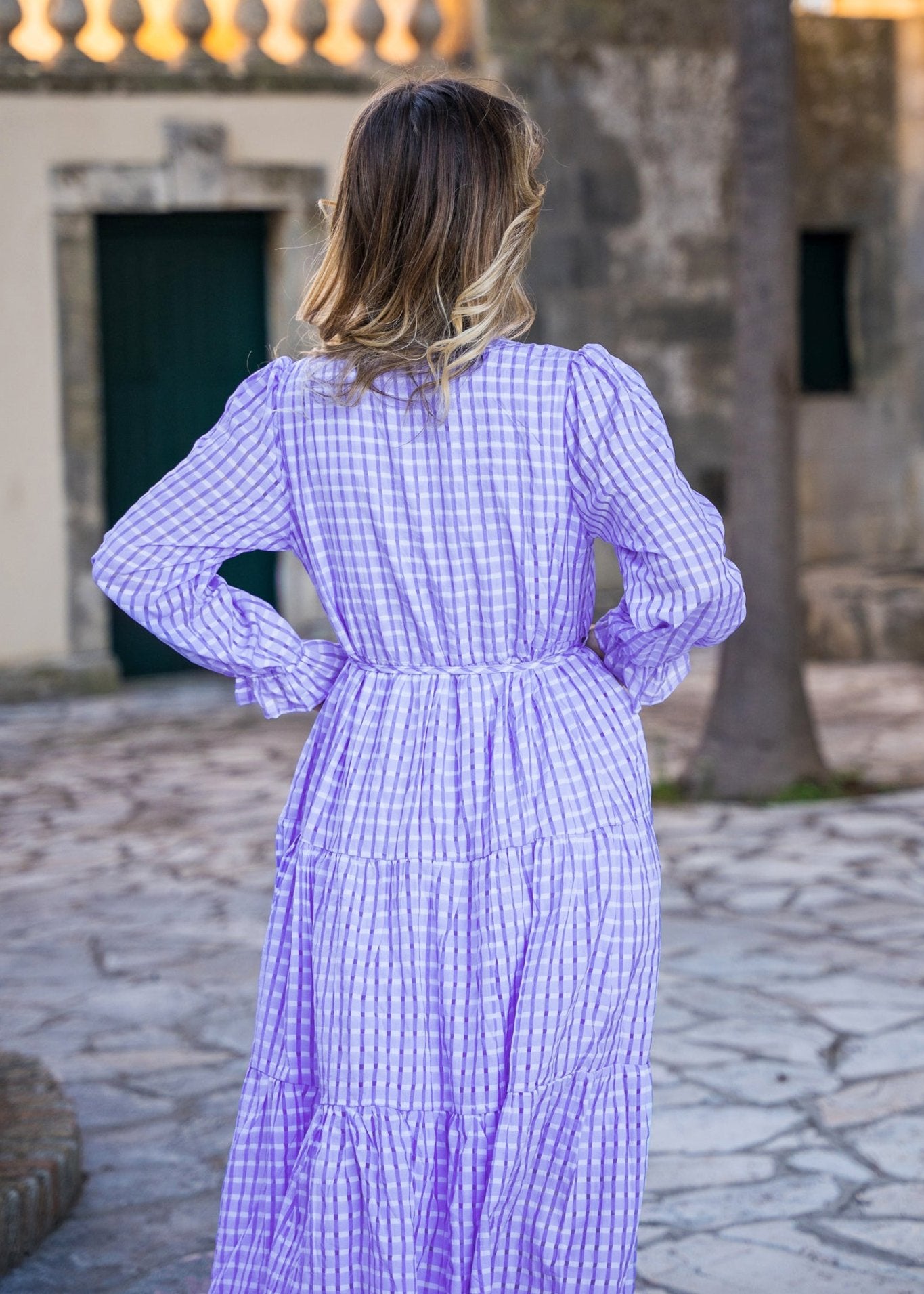 Μίντι φόρεμα με χαλαρή εφαρμογή, άνοιγμα V μπροστά, αφαιρούμενη ζώνη. Μακρύ φουσκωτό μανίκι με μικρή μανσέτα. Λοξές πλαϊνές τσέπες. Με φόδρα.