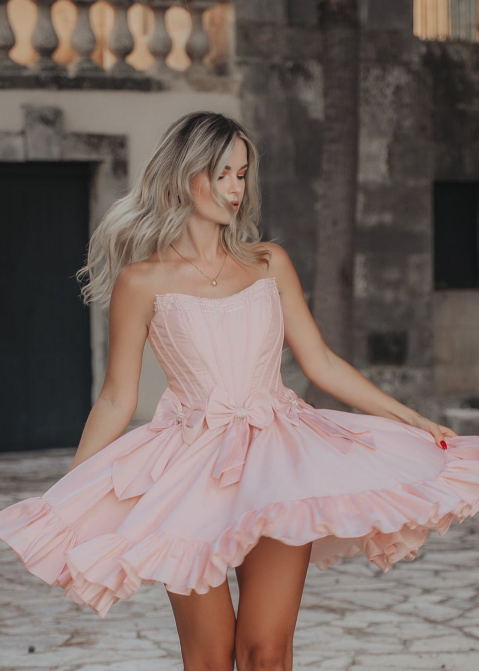 Κοντό εξωμο ρομαντικό φόρεμα με φιόγκους. Διακοσμημένο με στρας και κορσέ. Διαφανείς τιράντες. Με επένδυση, φόδρα και κρυφό φερμουάρ στην πλάτη.