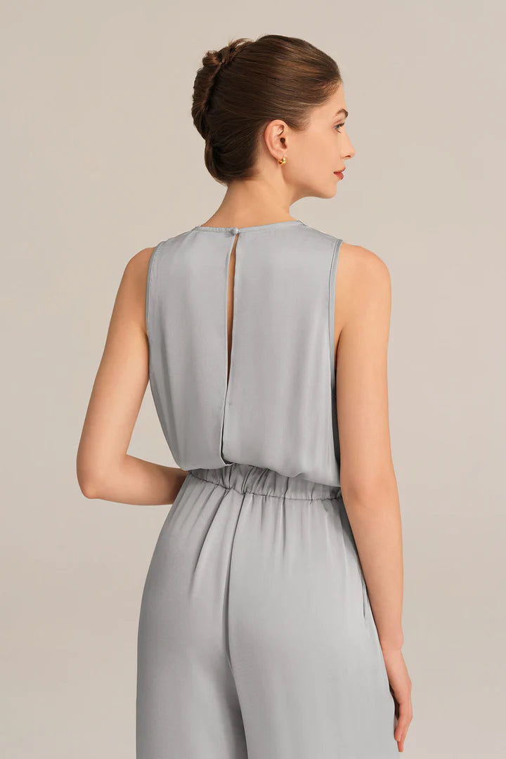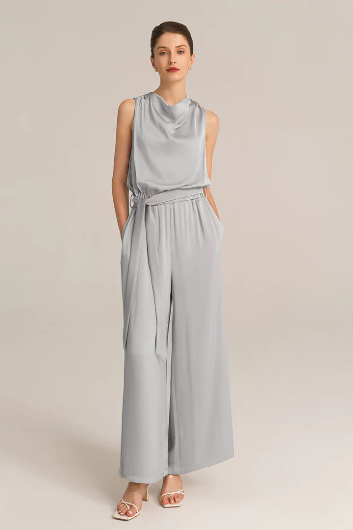 Ολόσωμη φόρμα από ελαφρώς ντραπέ σατέν με βαθύ άνοιγμα στην πλάτη με κουμπί στον αυχένα. Λοξές πλαϊνές τσέπες, αφαιρούμενη δετή ζώνη και λάστιχο στην στη μέση. Φαρδιά, ελαφρώς εβαζέ γραμμή στα πόδια.