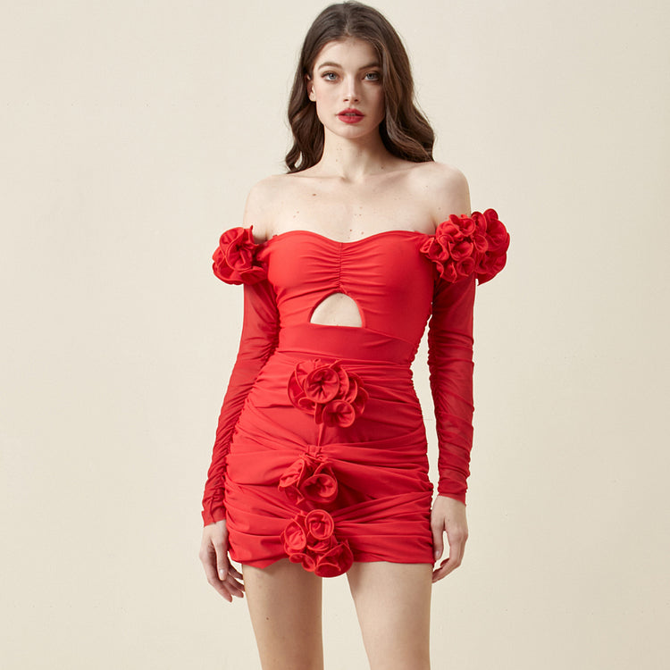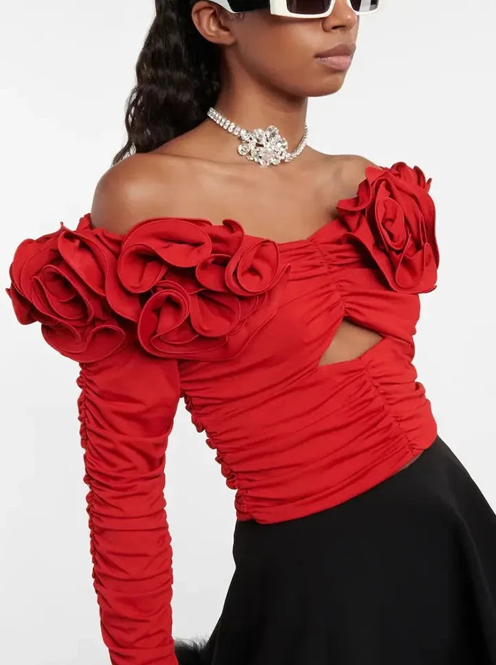 Εφαρμοστή έξωμη μπλούζα κορμάκι με λουλούδια και άνοιγμα. Μακρύ μανίκι και ίσιο τελείωμα. Μίνι φούστα με νοίγματα και λουλούδια.